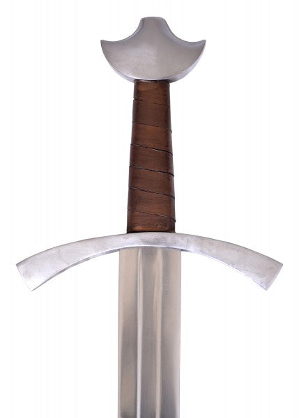 A unique feature of this sword is its knob, which is a shape variation of the Brazil nut knob. This knob has been worked from Oakeshott all the way back to the 13th century. This sword is exclusively handcrafted and features a forward-curved parry barrel and a Brazil nut knob made of cast iron for an authentic and durable look. Additionally, the spring steel blade passes through the knob and is hand-riveted there, giving it a flawless finish.