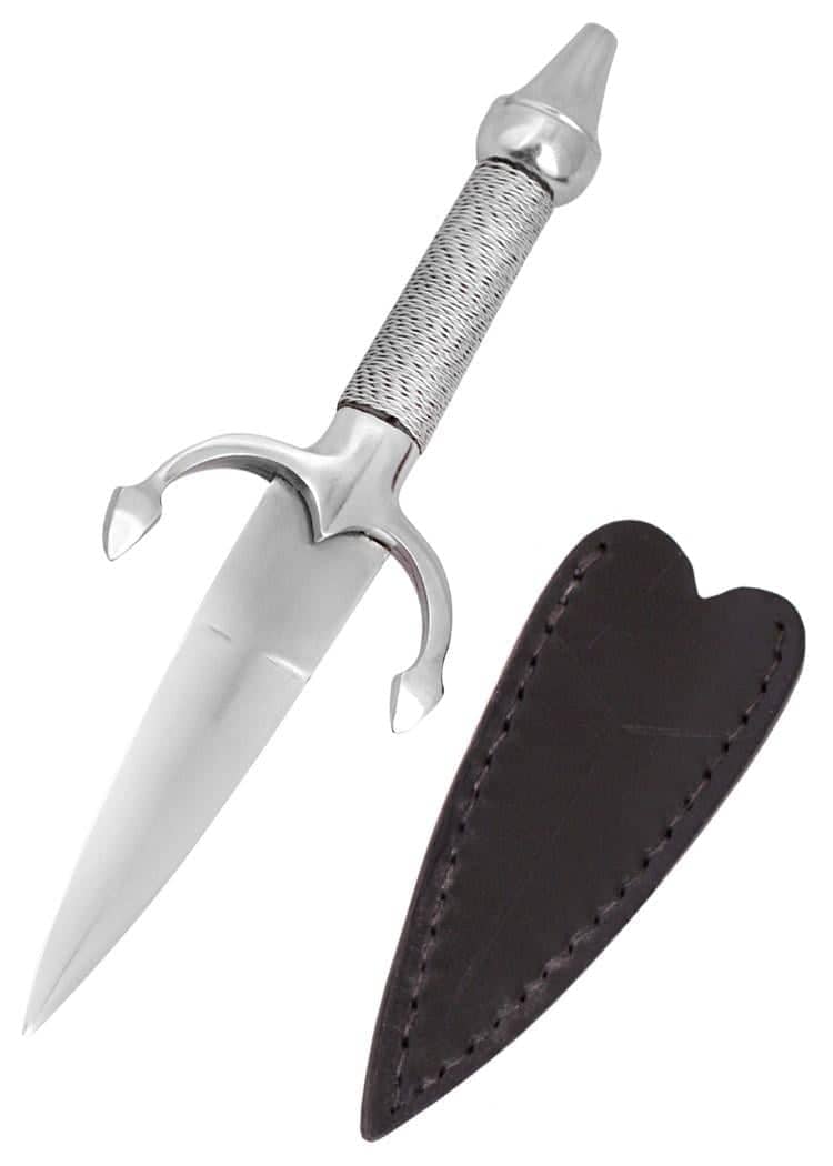small hand-forged dagger, called a lady's dagger. The steel version comes with a sheath made of cowhide. The knob, the quillons are made of steel and the handle is wrapped with wire.