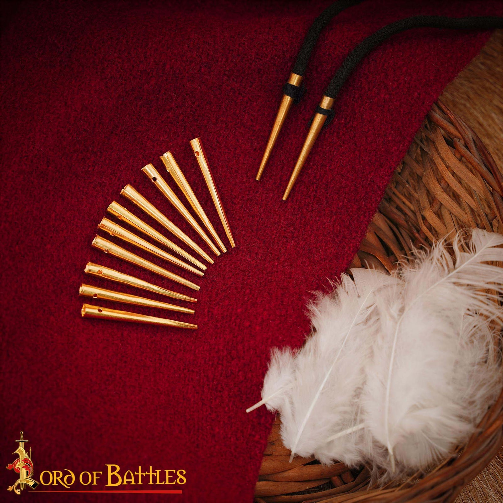 Each aiglet in this set of 10 is handcrafted from solid brass, giving it durability and an elegant shine that complements medieval or Renaissance attire. The tapered, conical profile ensures smooth threading through the eyelets, while the hollow shaft accommodates various sizes of cords or shoelaces.
