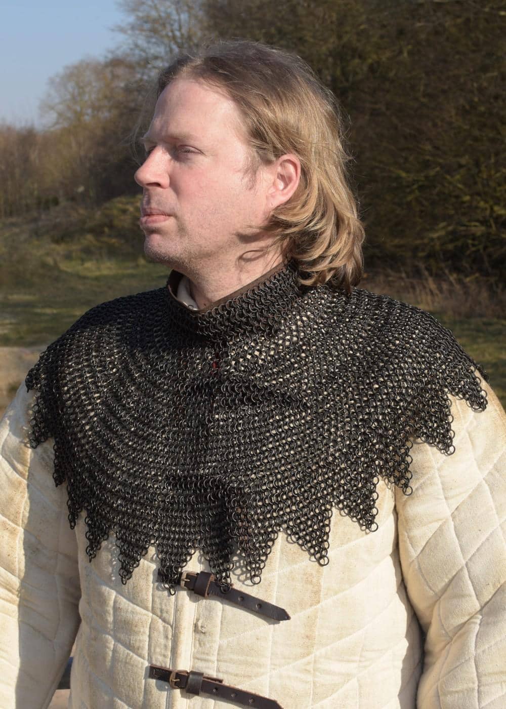 Our chainmail collars are based on historical models. They are serrated along the edge. The neck area is riveted with a leather strap and adjustable by straps and authentic bronze buckles.