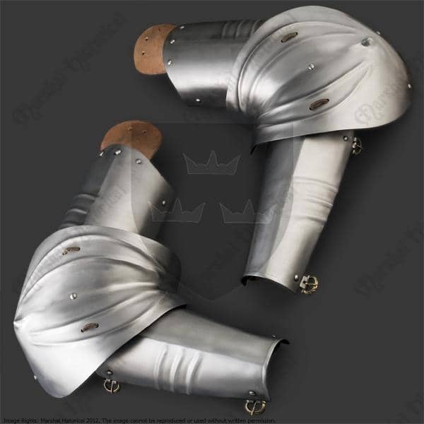 It is interesting to note the tendency of the Germans, who even in the very late stages of the 15th century still used half-arms combined with mesh, as opposed to the tubular arms, more typical of Milanese styles. However, the comfort and versatility of these pieces tied together with leather stitches, makes the wearer realize the freedom of movement and ease of repair in case of damage. The arms have various holes to raise or lower the height of the bracers and the elbow. The straps also help to properly fasten the arm.