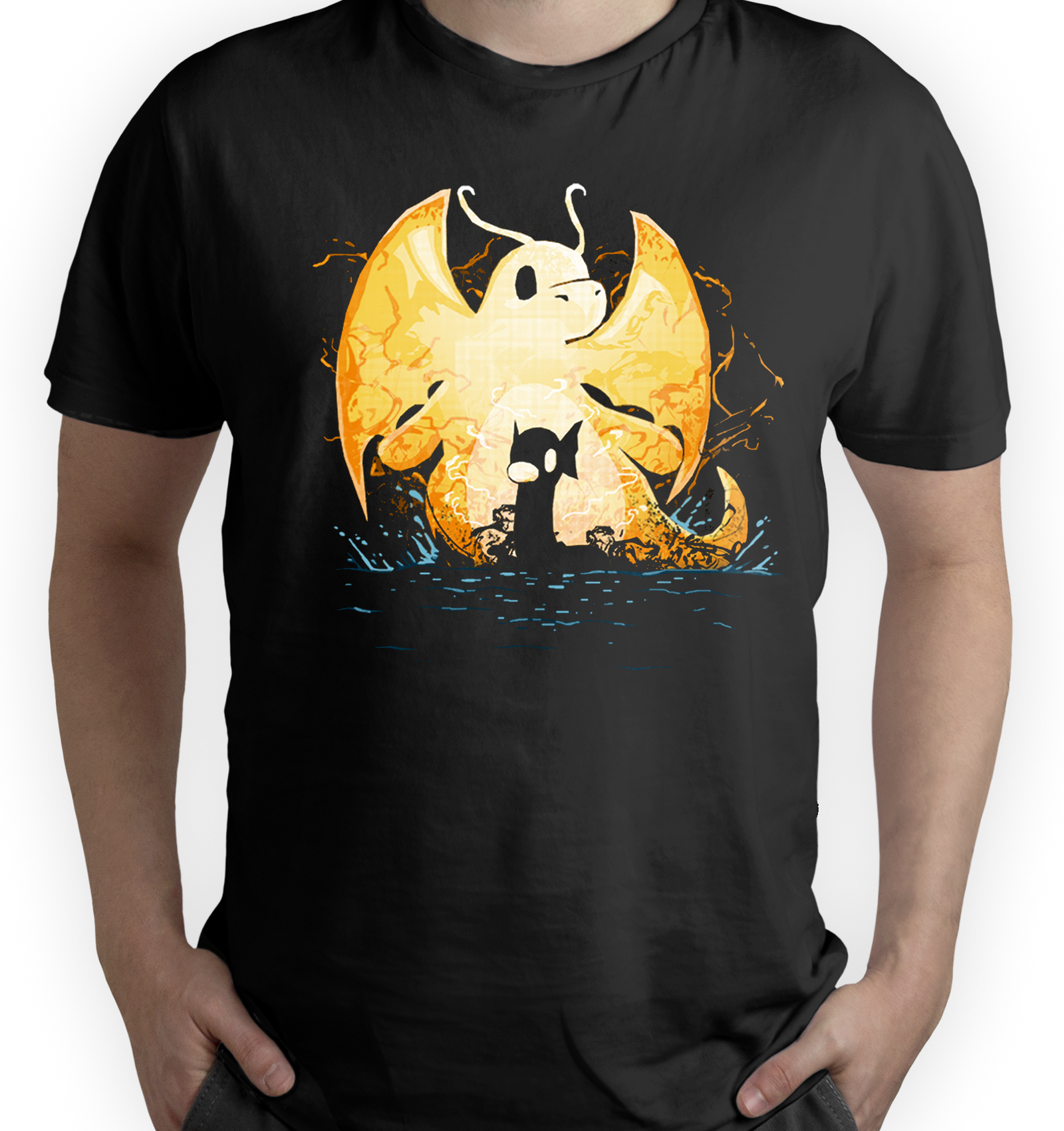 This black t-shirt features a creative and eye-catching design based on the video game "Hollow Knight". In the center of the graphic, the protagonist, the Knight, stands out in a heroic pose with his wings spread and glowing with an intense golden hue that simulates fire. This effect creates an impressive silhouette that stands out against the dark background of the t-shirt. The image combines shades of yellow, gold and orange that contrast vibrantly with the black base of the t-shirt.
