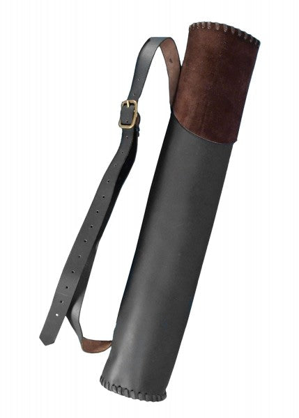LARP quiver for 10 arrows made of high-quality, robust leather with striking decorative stitching and suede trim at the opening for a special look. The strap is adjustable by means of a buckle up to a length of 107 centimetres and is worn around the neck and chest.