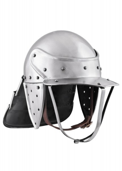 It consisted of a hemisphere-shaped helmet bell, cheek pieces with ear-holes, the characteristic neck shield, an eye or forehead shield and a nose plate. It was initially used by Hungarian hussars and Polish cavalrymen, but was also used in Central Europe by arquebus and dragoon riders from the 17th century onwards.