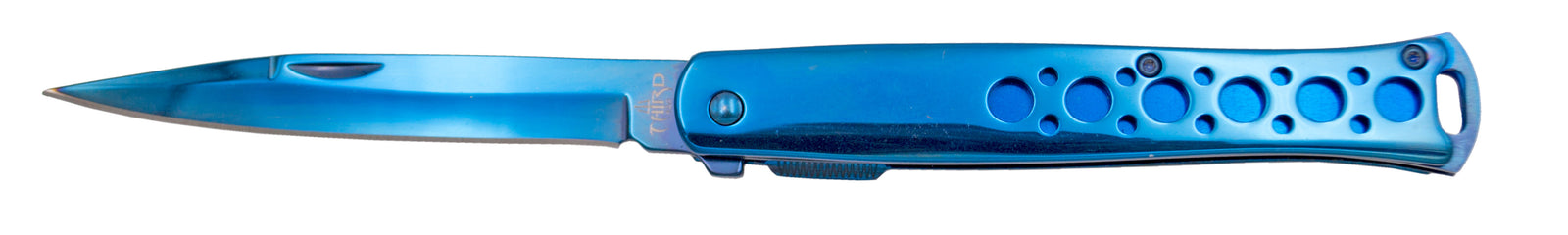 Third N86C stiletto with a bright blue titanium-plated aluminum handle and a 10.2 cm bright blue titanium-plated stainless steel blade, with clip. Ref. N86C