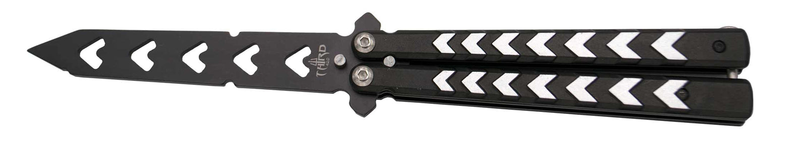 Third K2813-3 Practice Fan Knife with 12.6 cm black 420 steel blade, black and silver stainless steel and aluminum handle. Spring lock. Ref. K2813-3