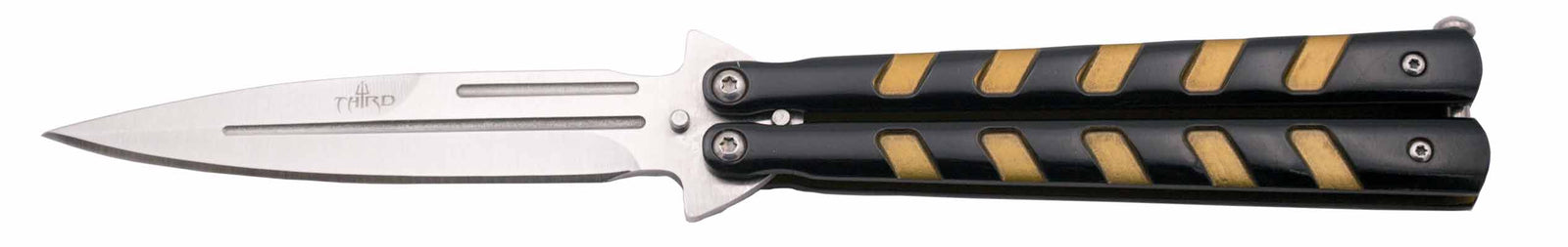 Third 16100Y fan knife, 12 cm satin-finished stainless steel blade with fullers, black stainless steel handle with gold details. Ref. 16100Y