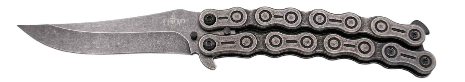 Third K2819 fan knife with 10.2 cm 420 steel blade, clean stone finish, stainless steel chain-shaped handle, clean stone finish. Spring lock. Ref. K2819