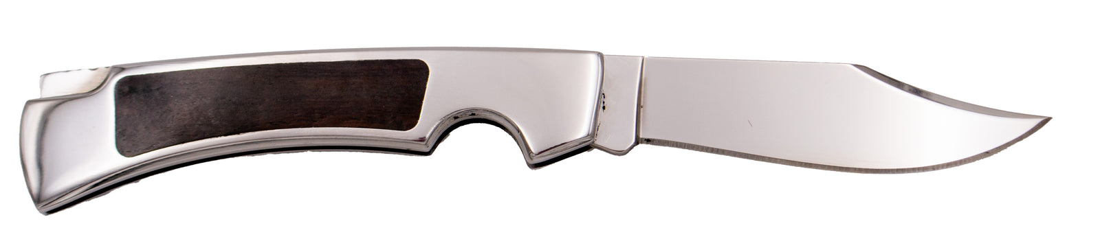 Tramuntana Knives N93E Great Dane folding knife with a mirror-finished stainless steel handle and ebony wood insert, a 7 cm mirror-finished 440 steel blade, a rear-locking blade, and a decorative spring. Comes with a presentation box. Ref. N93E