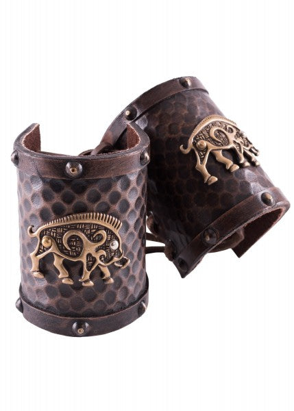 These beautiful, high-quality arm warmers are made of strong leather, which has been vegetable tanned and dyed. For optimal comfort, the interior is lined with soft scoop. A finely detailed, riveted Celtic boar made of brass with an antique finish adorns the center of the tulip. The arm guard is lined with round brass pins and eyelets (also with an antique finish) and comes with a sturdy leather strap for individual lacing on the wrist.