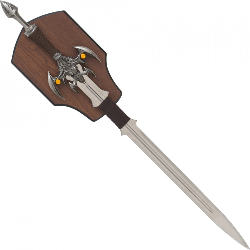 This decorative fantasy sword captivates with a dragon skull with an elaborate stop shape. The 420 stainless steel blade is decorated with mystical runes. With wooden wall plaque.