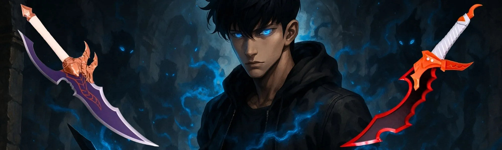 At Swords and More, we're excited to introduce our epic new collection: Solo Leveling . Immerse yourself in the world of humanity's strongest hunter, Sung Jinwoo, and take home items that will make you feel like you're inside the most dangerous dungeons.