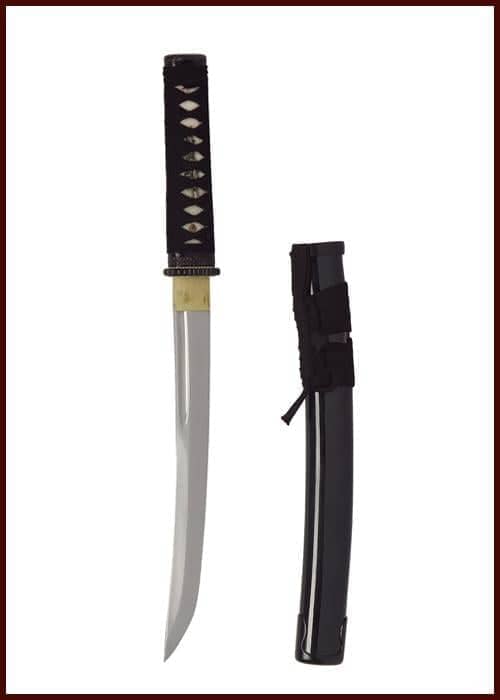 The John Lee Aikuchi Tanto is a true masterpiece of Asian swordsmithing that represents the craftsmanship and tradition of ancient Japan at its finest. Handcrafted, the knife's blade is made from carbon steel and is hardened according to the traditional technique. This razor-sharp blade is further provided with a Bo-hi (channel) to reduce its weight. The knife's wooden handle is covered with real fish skin and wrapped with black cotton in the traditional manner. Additionally, there are two menuki on the handle that help to enhance the comfort when holding the knife while in use.