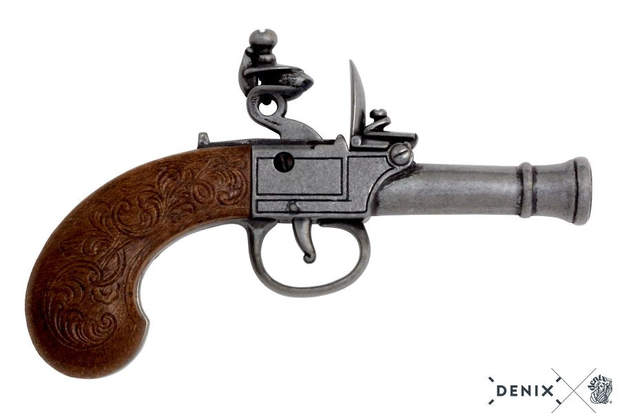 Relive the era of battles and duels with this non-functional replica of the 18th century English flintlock pistol, made by Denix. This high-quality piece allows you to appreciate the ingenuity and beauty of the period's firearms in a safe and decorative way.