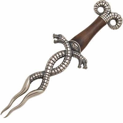 This dagger features a stunning design of two intertwined snakes in 1055 carbon steel, inspired by Thulsa Doom. Nickel plated with antique finish. Wooden handle.
