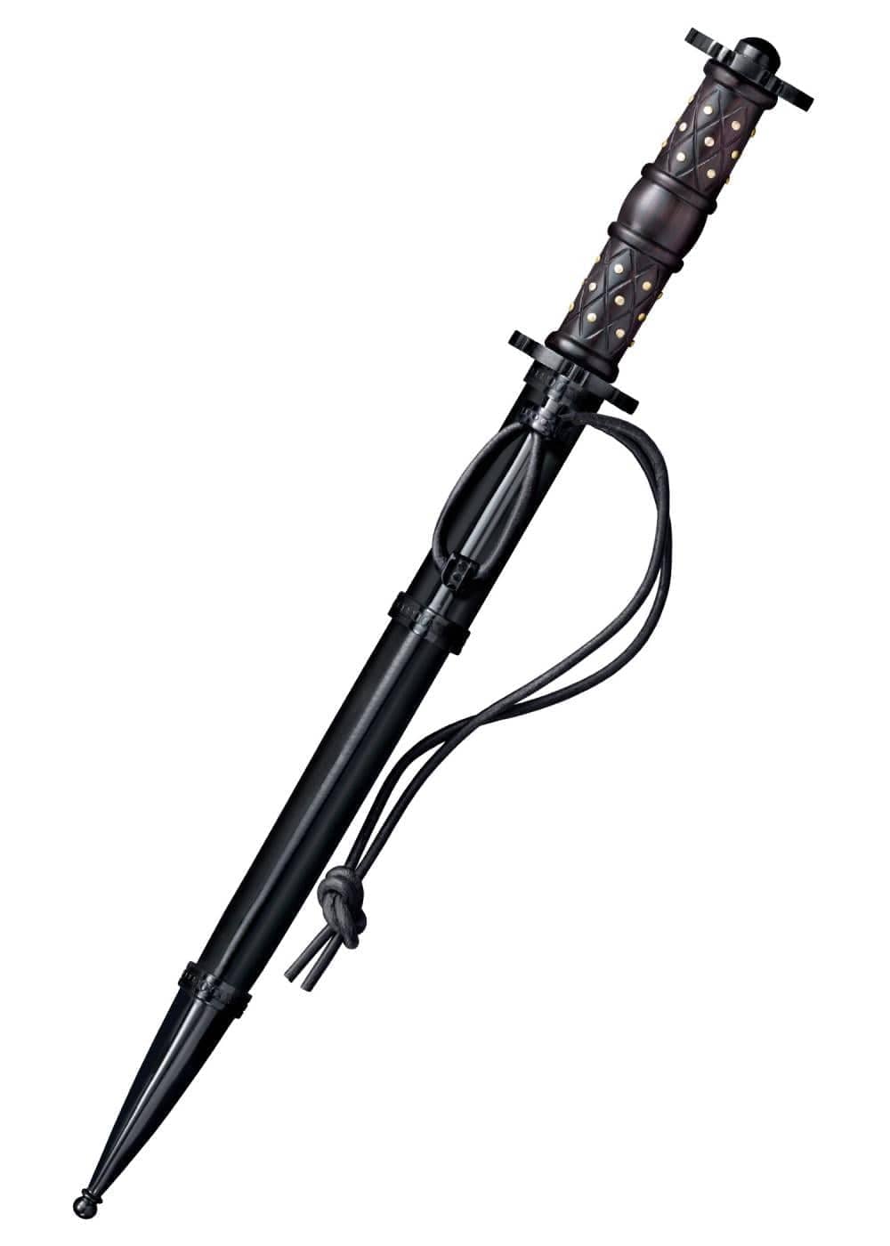 The long, straight blade of the Cold Steels Disc Dagger is hollow ground and has three cutting edges. It is incredibly rigid and sharpens to an extremely sharp point. It also has a deep blued color and hand-cut edges, giving the dagger a beautiful look. The turned rosewood handle is decorated with elaborate hand carvings and fitted with small brass pins that are both decorative and provide extra grip. The elegant discs on the parier and pommel have been embellished with filing and offer excellent hand protection.