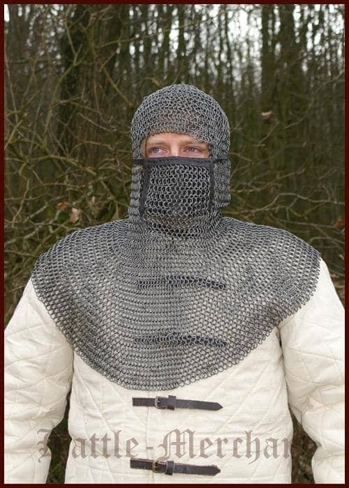 The hood protects the head, neck, shoulders and mouth, as it has a sewn-on square chainmail accessory with padded lining to protect the jaw.