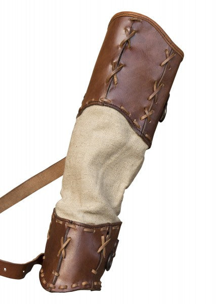 Made of brown or black vegetable-tanned cowhide and sand-coloured cotton canvas, suitable for most LARP arrows . The upper and lower third consist of leather panels connected with leather cords, the middle part of canvas. Three metal D-rings with an inner diameter of approx. 2.5 cm are attached to the leather parts, with which the shoulder strap can be individually mounted. A special detail here is the belt holder attached to the shoulder strap, with which the quiver can also be comfortably worn on hip blades.