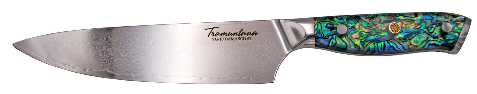 Tramuntana kitchen knife model CD10 Chef 67-layer VG10 Damascus steel blade measuring 20.6 cm, Abalone handle with epoxy, with presentation box. Imported item. Ref. CD10