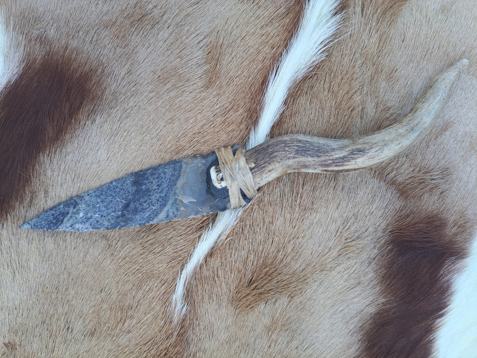 The APACHE model flint knife features a sturdy staghorn handle, secured with primitive pitch and sinew.