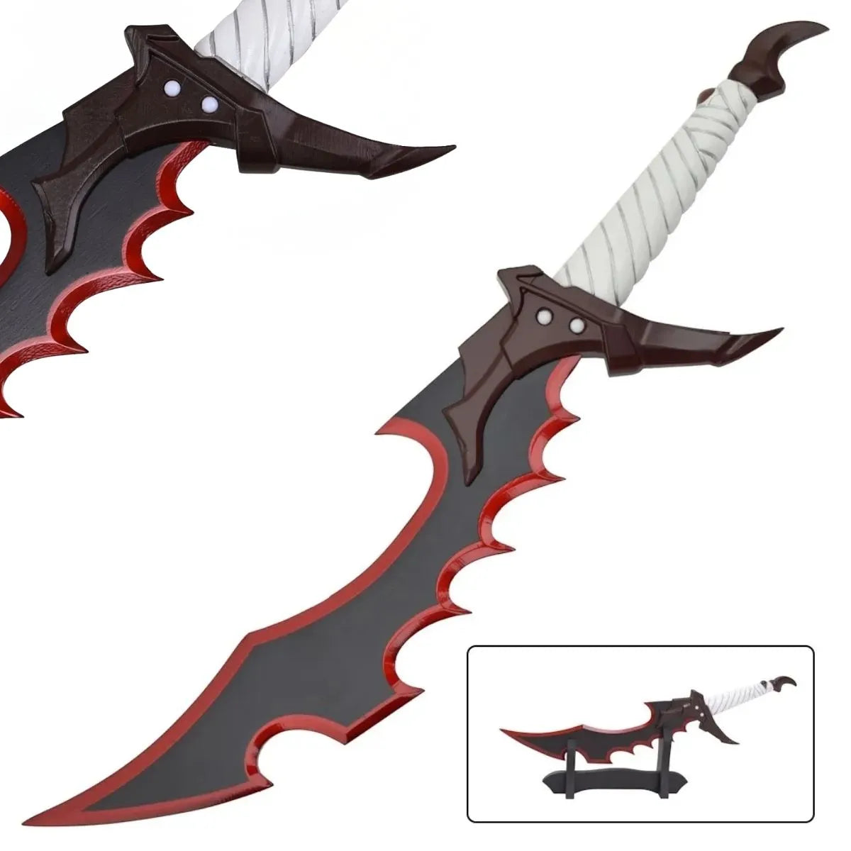 La hoja de acero presenta un acabado negro con el corte resaltado en rojo, creando una estética intimidante y peligrosa. La guarda en color naranja aporta un contraste vibrante, mientras que el mango en color gris equilibra el conjunto con sobriedad. Incluye soporte de exhibición, reforzando su carácter decorativo y coleccionable.