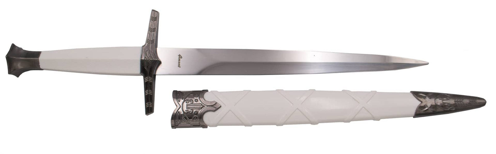 Miniature replica of Geralt de Riva's silver sword (The Witcher), unofficial replica, it is the model that appears in the Netflix series. With a total size of 40 cm, with a nickel-colored cross with decorations and a white handle, steel blade and white plastic sheath.