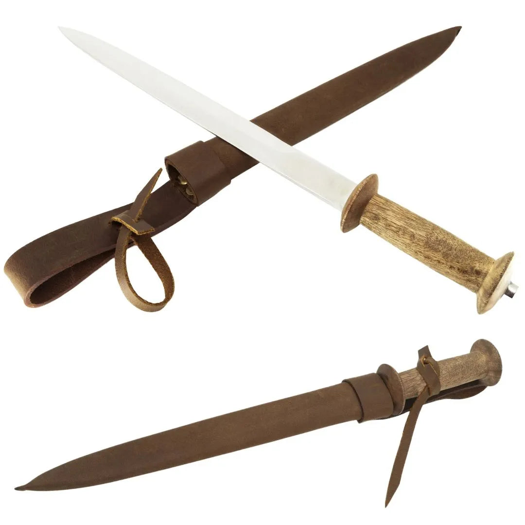 Medieval Rondel Dagger with Wooden Handle and Leather Scabbard