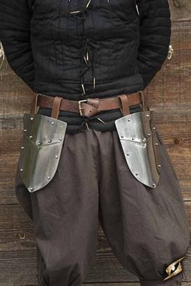 Epic Armoury's Soldier Belt Shields are two plates designed to protect the thighs. These rolled edge steel plates hang from their own belt to cover the outside of the thighs, sliding into place using brown leather loops securely fastened with rivets. Each plate measures 25cm long and 21cm wide, with two 24cm folded leather belt loops.