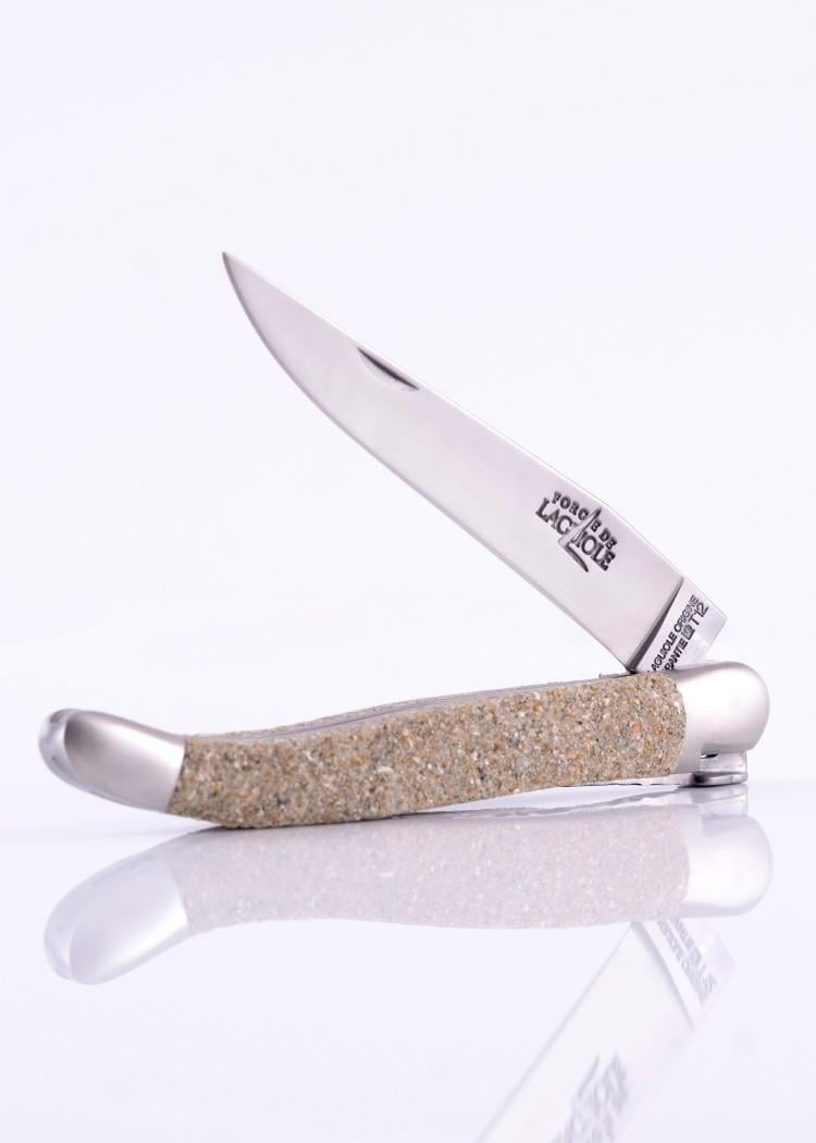 UNESCO declared Mont Saint-Michel a World Heritage Site in 1979, the second most popular tourist destination in France after the Eiffel Tower. The beach at Mont Saint-Michel is one of the most beautiful in the world. The sand from this beach was used to create the shapely handle of this knife. Mixed with a natural resin, this sand now forms the unique handle of this knife. The blade is made from a steel made especially for Forge de Laguiole, called T12, with a Rockwell hardness of 57-58.