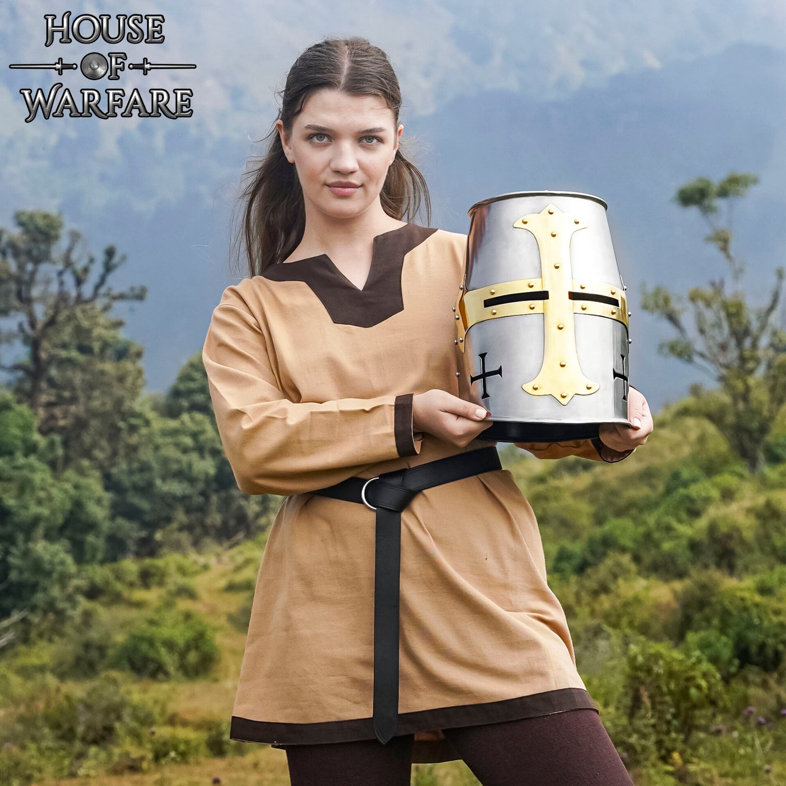 This barrel helmet evolved with the rise of heavy cavalry and knightly warfare, especially during the Crusades. Its