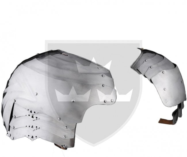 Our German Asymmetrical Shoulder Pads are designed in the late 15th century Gothic style and was popular with knights in Germany, France and England. The left shoulder is more reinforced than the right as this side of the body is more likely to take a blow from a right-handed swordsman. The top of the shoulder is pierced with armour points (holes) to allow the armour to be attached to a breastplate or chainmail. Made from 1mm (18 gauge) steel making them ideal for LARP re-enactment.