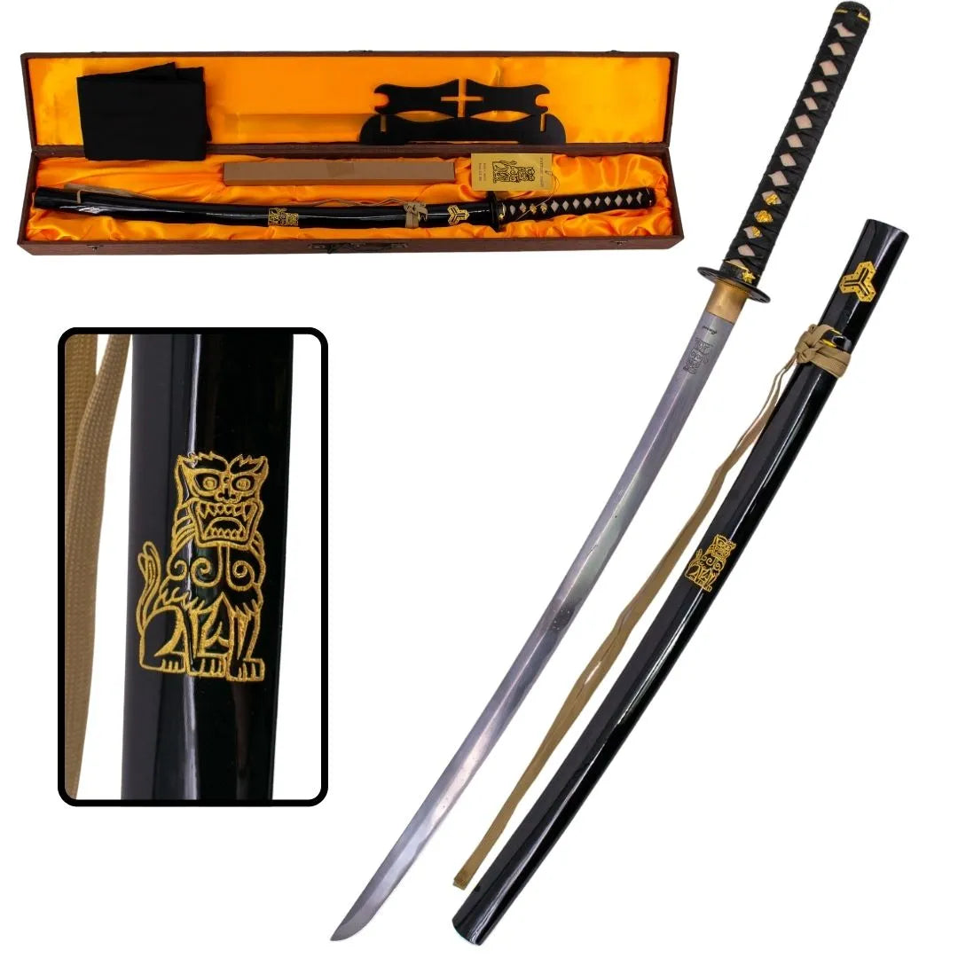 - Exclusive engravings , with a lion on the blade and three emblems on the Tsuba and Kashira.