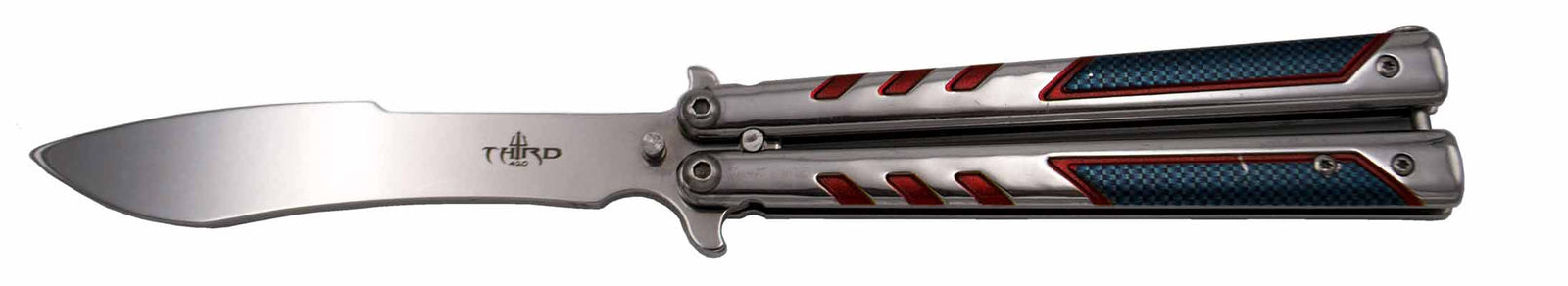 Third K2817RDX practice fan knife with 10.6 cm 420 steel blade with a dull, shiny polished finish, stainless steel handle with a shiny polished finish with red decoration and 3D carbon fiber primer. Spring lock. Ref. K2817RDX