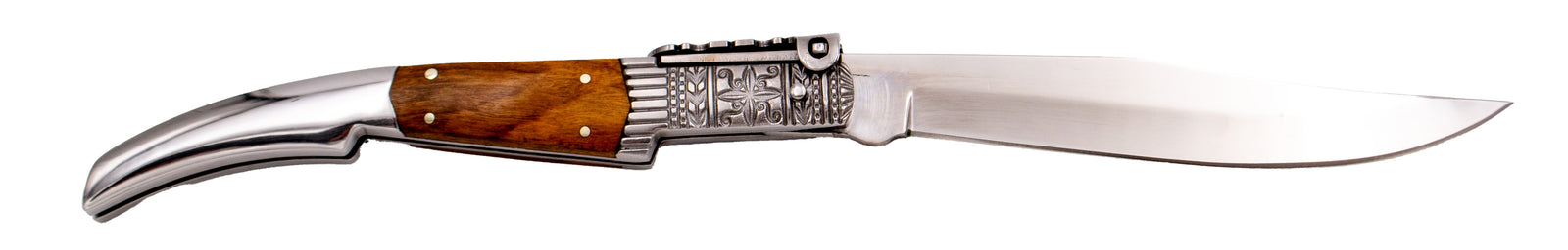 Third Series Amber Silk N49OD ratchet knife, made with CNC technology, handle with stainless steel bolsters with decorative bas-relief based on classic 19th-century Spanish knives and olive wood inserts, 11 cm mirror-finished 440 steel blade, with decorated spring and spring bar. With presentation box. Ref. N49OD