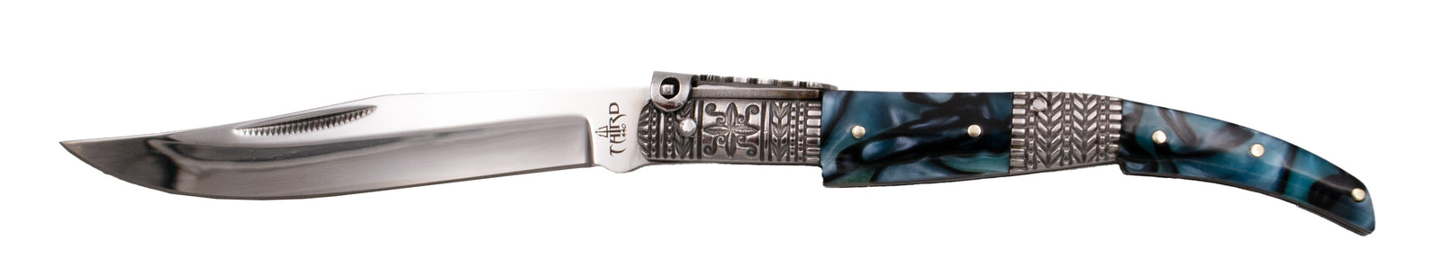 Third Series Seda Zafiro N53AD ratchet knife, made with CNC technology, handle with stainless steel bolsters with decorative bas-relief based on classic 19th-century Spanish knives and blue acrylic inserts, 11 cm mirror-finished 440 steel blade with decorated spring and spring bar. Comes with presentation box. Ref. N53AD
