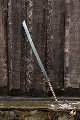 The Nodachi is 140 cm long and has a 100 cm long single-edged blade. It has a large oval crossguard and a small rounded pommel. The oval shape of the hilt helps to steer the blade intuitively, and it is adorned with menu bindings made from top grain leather. The menuki-bind is double layered and made of contrasting colours, creating a diamond pattern.
