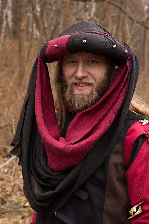 Epic Armoury's Turban Jafar Black/Dark Red is a beaded cotton hat inspired by ethnic groups from North Africa and the Middle East. This turban covers the entire head, providing protection from the sun and sand. A beaded chain hangs down the side of the turban and along the rolled brim, adding detail and a layering element befitting a quality costume. The rich fabric alternates between a dark red and black to give it depth and a particularly rich look.