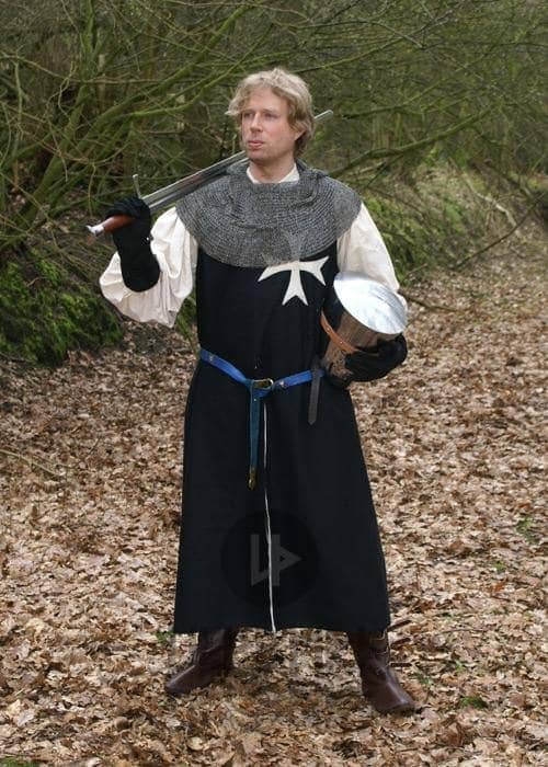 Knight's tunic with lining, The skirt armour or tabard was worn by many crusaders over the armour, often in combination with the corresponding cloak. Of course, the cross that the knight wore to fight for the liberation of Jerusalem should be highlighted. The cut of this cloak and the material are chosen very authentically based on historical models. The cross is on the left above the heart. The tunic is slit at the front and back.