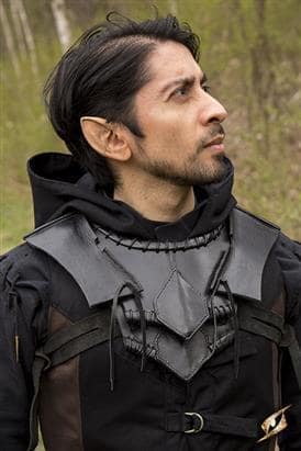 Leather armor designed to protect the neck and upper chest. Made from full-grain black leather, this armor is made of multiple overlapping plates, creating flexibility and comfort while protecting the chest and neck. The shoulder plates are removable, and are shaped in a traditional Dark Elf fashion. All exposed edges are reinforced with durable stitching to prevent warping with excessive use.