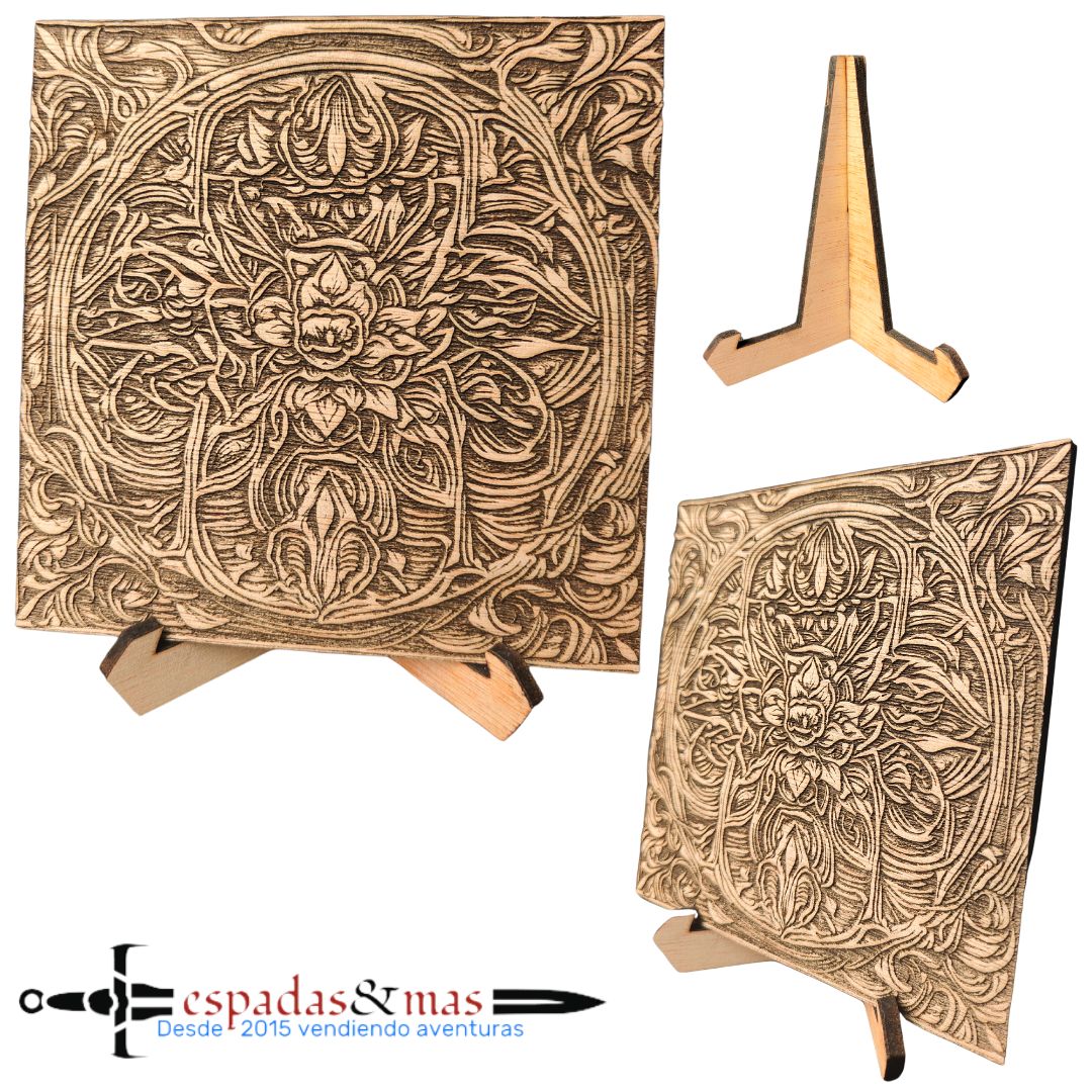 Made of burnt wood with relief.