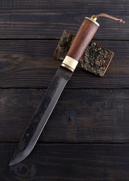 The razor-sharp high-carbon steel blade is not fully polished. The flats still show forging marks that give the knife a rustic appearance.