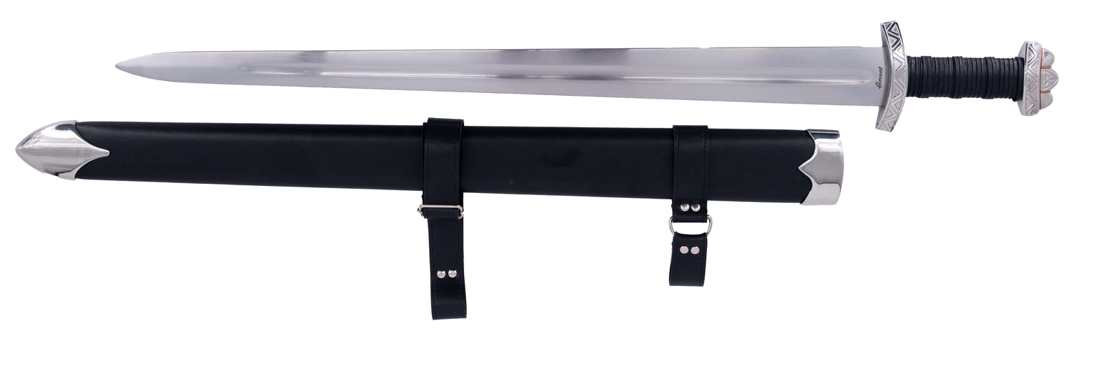 La hoja está fabricada en acero al carbono 1065, un material muy apreciado por su resistencia y capacidad de absorción de impactos. El mango está revestido en piel, proporcionando un agarre firme y seguro. Incluye una funda de madera forrada en piel con anclajes metálicos, fiel al estilo histórico de las armas vikingas.