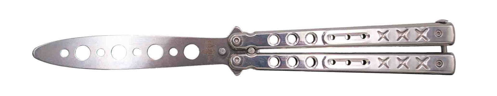 Third K2831X practice fan knife with 10.8 cm 420 steel mirror finish blunt blade with holes, mirror finish steel handle with holes. Ref. K2831X