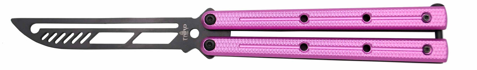 Third K2921P practice fan knife with 10.5 cm black 420 steel blade, stainless steel and purple aluminum handle. Ref. K2921P