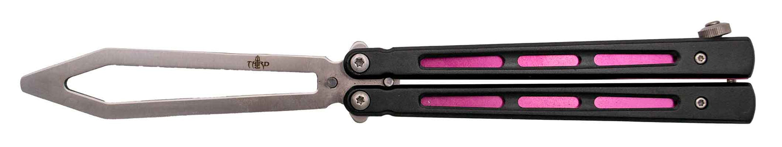 Third K2928W practice fan knife with 10 cm satin 420 steel blade, black and purple stainless steel and aluminum handle. Ref. K2928W