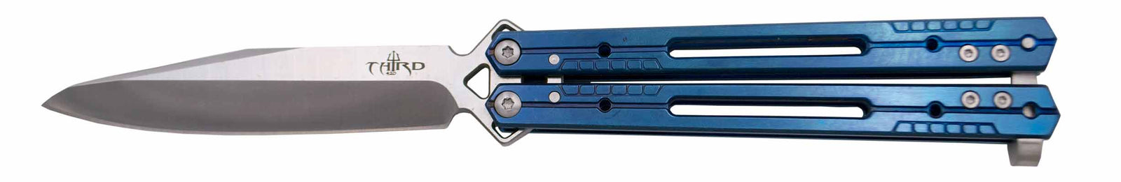 Third K2920A fan knife made with CNC laser technology, 10.5 cm satin-finished 420 steel blade, titanium blue plated stainless steel handle. Ref. K2920A