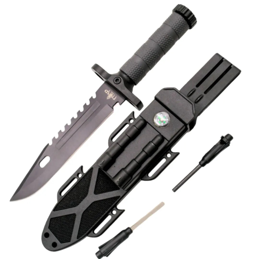 Discover the Third Survival Knife , an essential tool designed for the most demanding adventurers. Featuring an imposing 19cm 420 stainless steel blade, this knife not only offers exceptional strength and durability, but also guarantees a precise and effective cut in any extreme situation. Its black-finished fiberglass handle provides a firm and secure grip, allowing you to handle it with complete confidence in adverse conditions.
