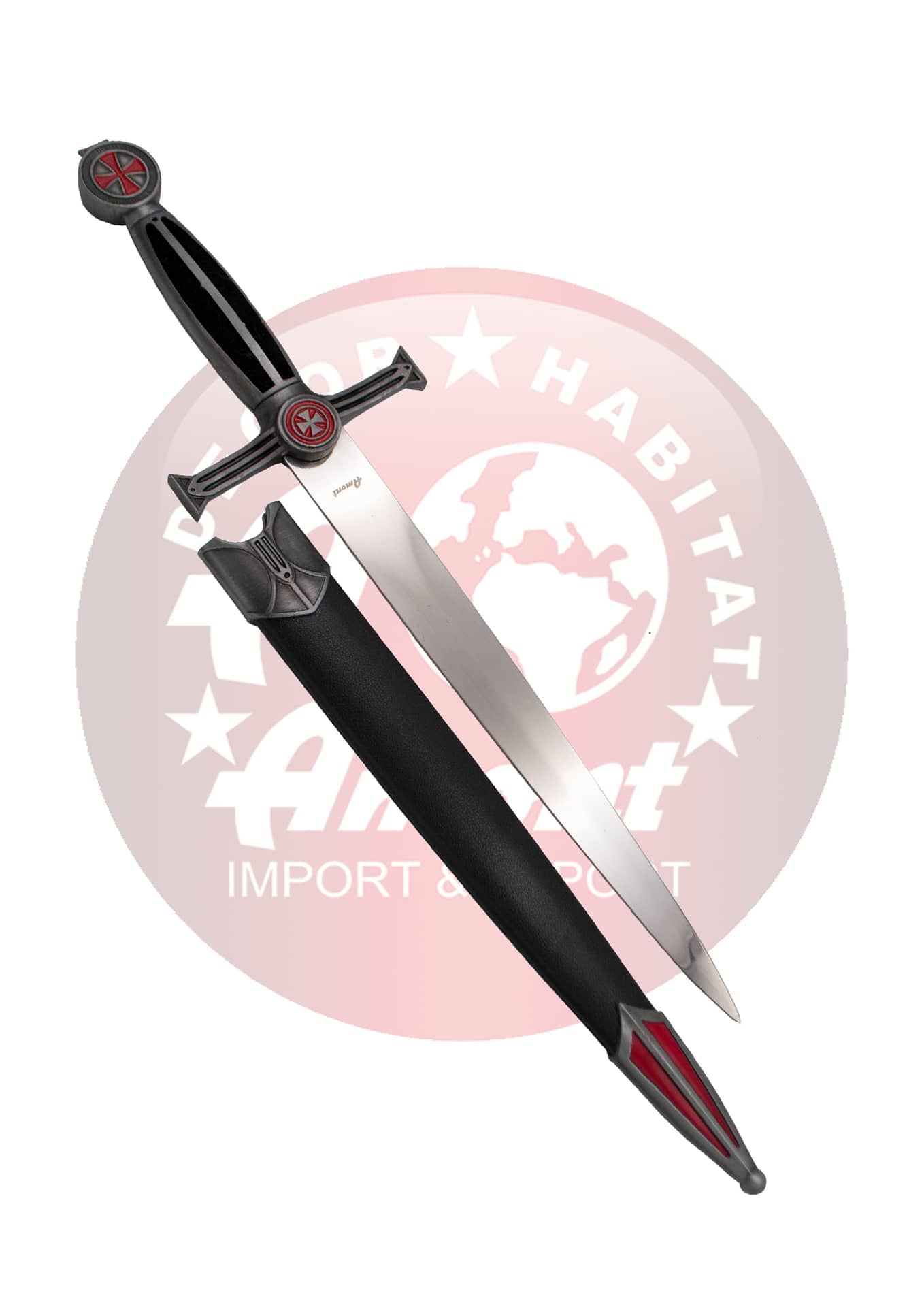 Exclusive design dagger, the pommel is finished with a red Templar cross, the guard is finished in nickel and accompanied by embossing. The decoration contains a small shield and the Templar cross in nickel. The total size is 43 cm of steel blade.