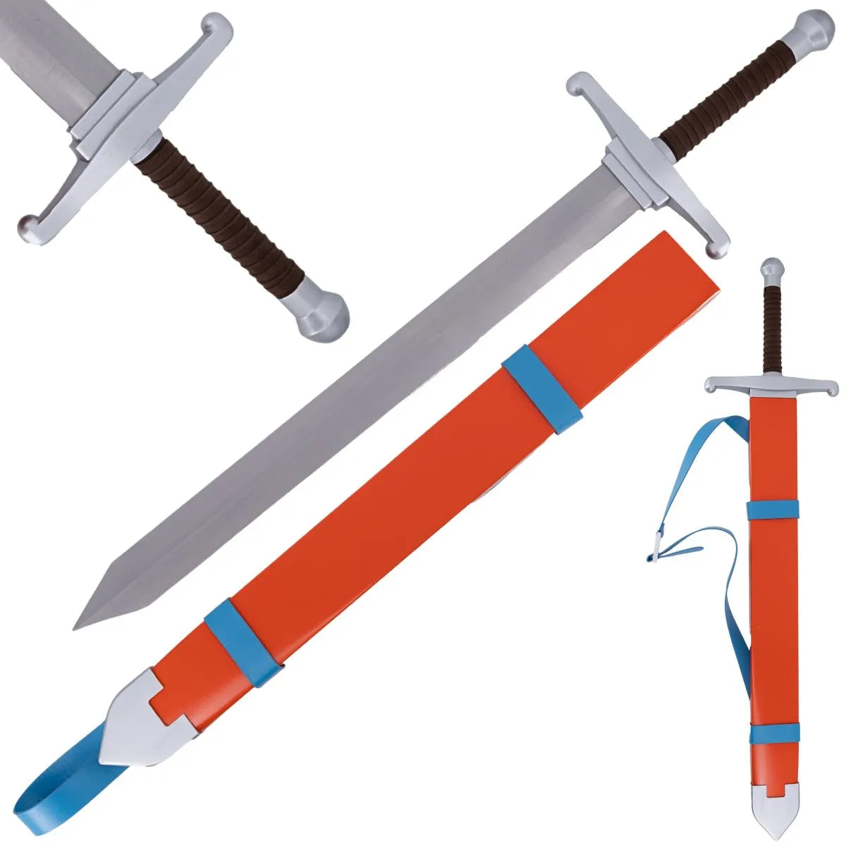 La hoja está fabricada en acero, concebida exclusivamente para exposición. Se acompaña de una funda de madera pintada en rojo con detalles azules, que mantiene la identidad visual característica del arma en la serie. Incorpora tira de polipiel para colgar, facilitando su porte o exhibición mural. El mango acabado en polipiel completa el conjunto con un diseño equilibrado y reconocible.