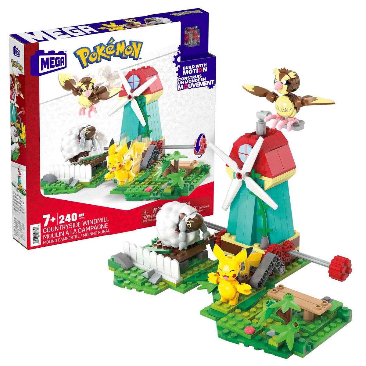 Construction set. age: 5-7 years. size: 29x4x26cm. contains: 240 pieces. 240-piece construction set with the innovative motion block that allows the toy to move. includes pikachu, pidgey and wooloo figures, and a buildable windmill and rural setting. the adventure builder sets can be connected to create a moving pokémon world. ideal for ages 7 and up, these construction toys help stimulate creativity and develop problem-solving skills. officially licensed by the pokémon company international. warning: not suitable for children under 36 months.